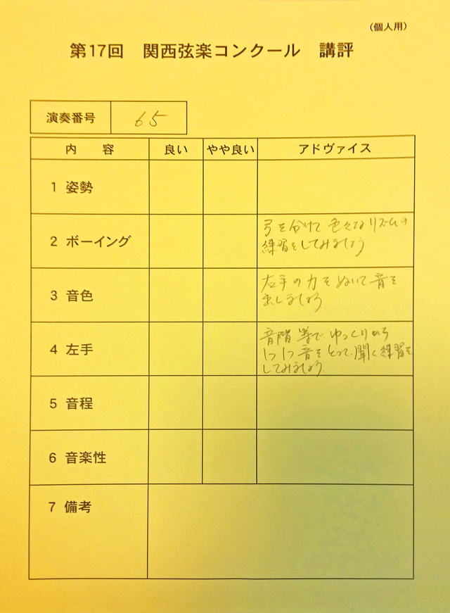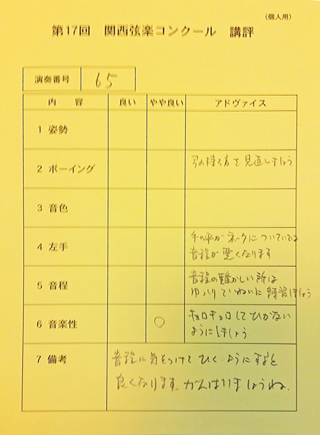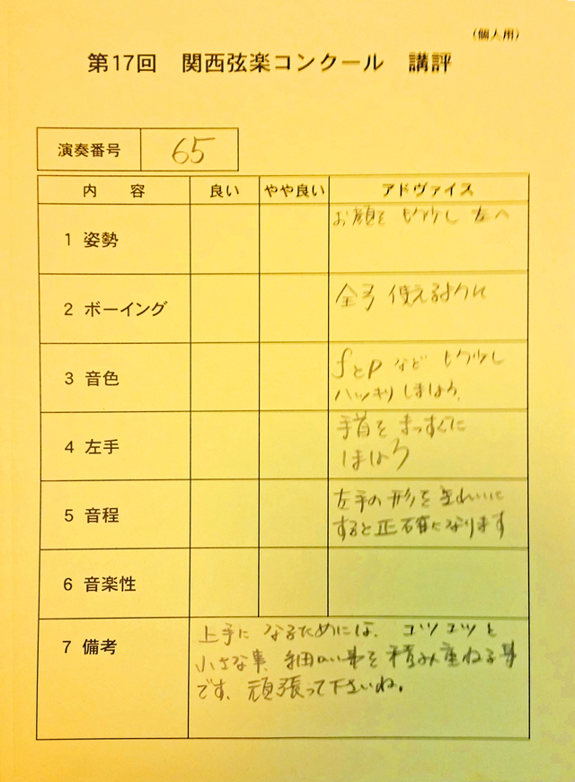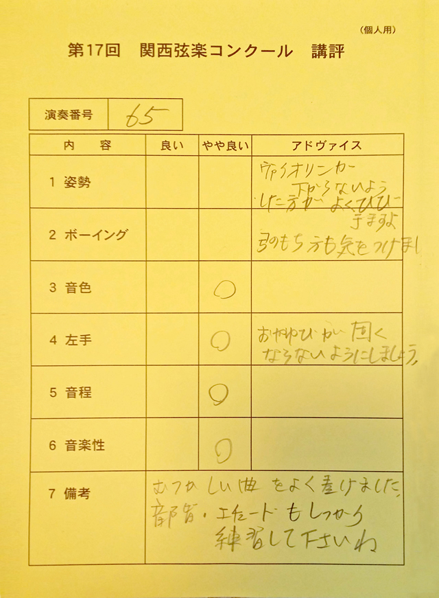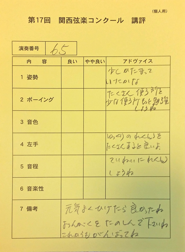 国内で行われています多くのヴァイオリンコンクールの審査員は、私と同じ社団法人日本弦楽指導者協会の公認指導者がしています。 近い将来に日本のヴァイオリンコンク−ルに出られたい方にも、その為にも親切丁寧にお教えしていきます。