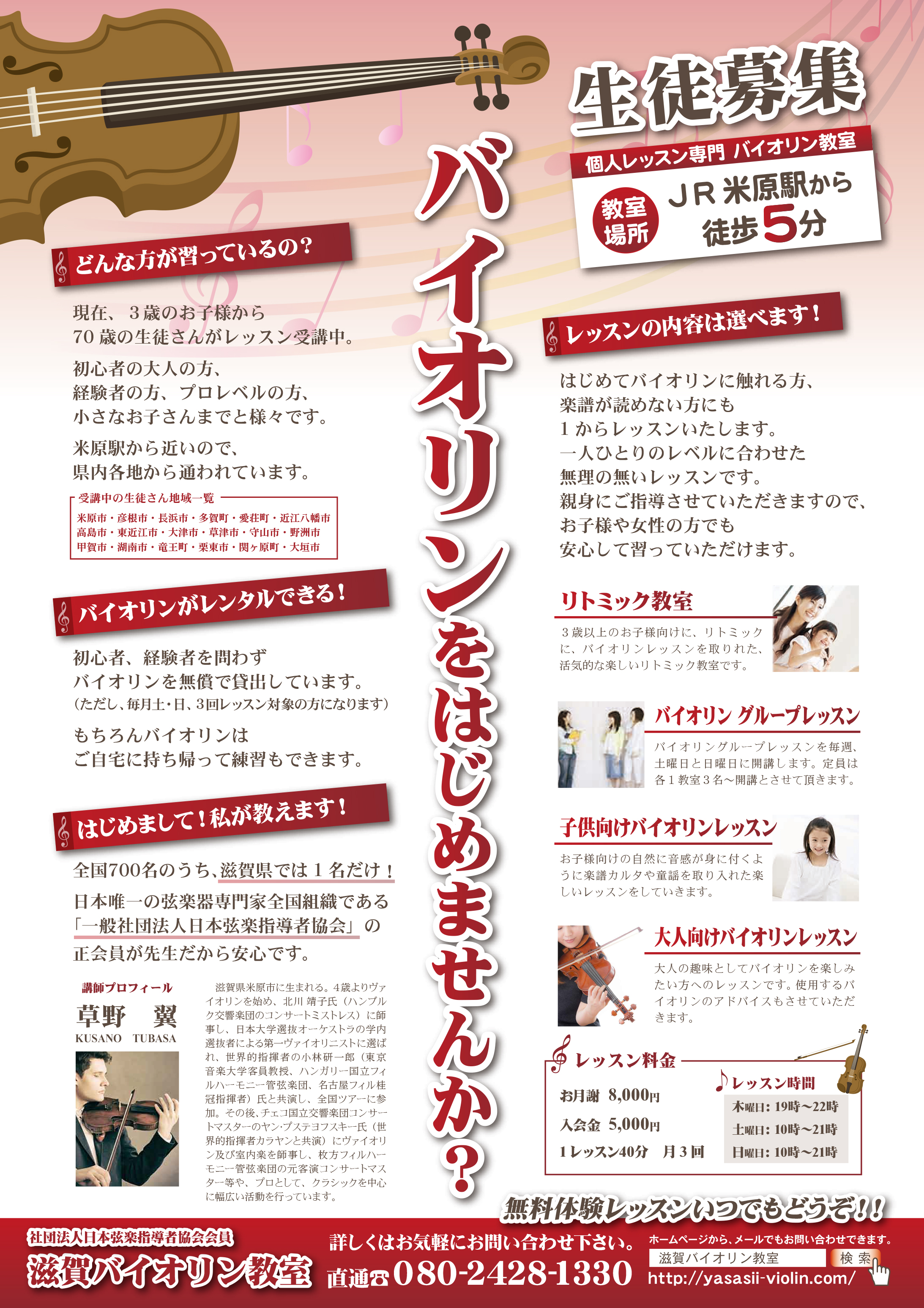 電話がつながらない場合は、インターネットから、社団法人日本弦楽指導者協会会員 滋賀バイオリン教室と検索して頂き、ホームページから、メールでもお問い合わせ下さい。