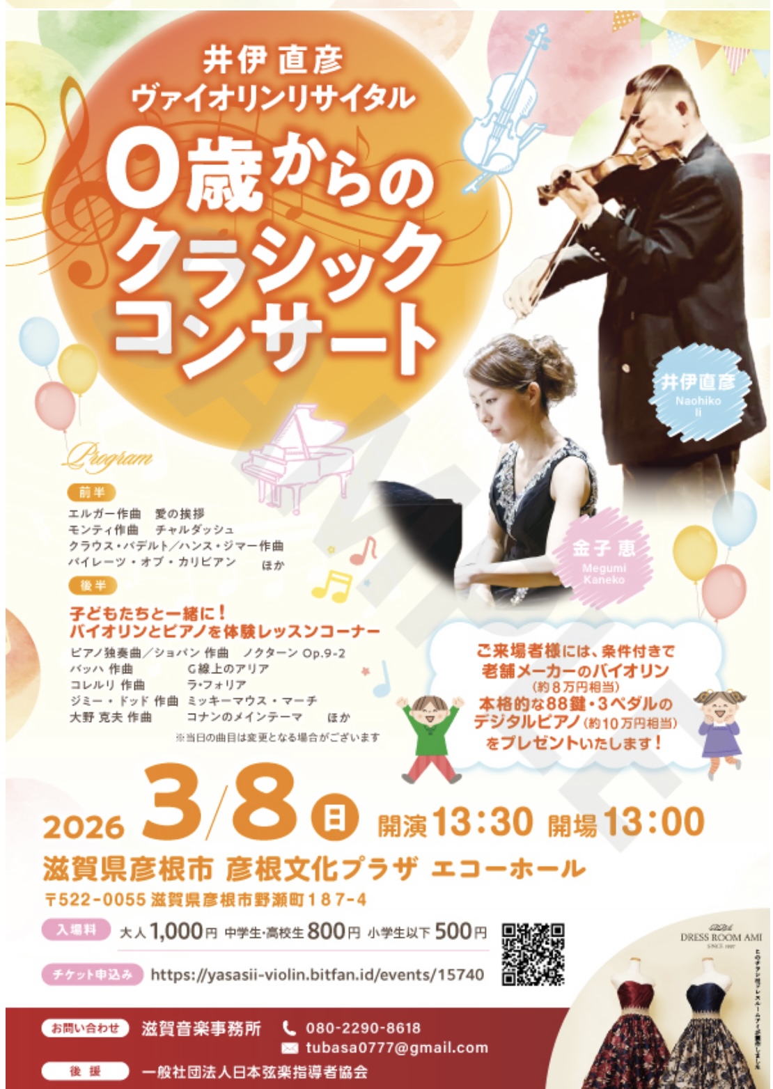 来年の11月には、世界的指揮者の佐渡 裕さんが芸術監督・指揮者をしている、兵庫県立芸術文化センターでバイオリンコンサートを行うなど、演奏活動も積極的に行っております。